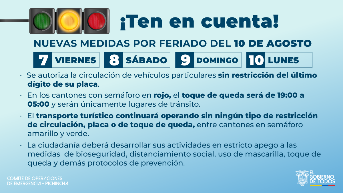 Se elimina la restricción de circulación por placas y se ejecuta una reducción del toque de queda en cantones con semáforo rojo únicamente desde este viernes 7 de agosto hasta el lunes 10 de agosto. Regirá para todos los cantones sin importar su semáforo. El COE Nacional anunció una serie de resoluciones para facilitar la movilidad de las personas con motivo del feriado del 10 de agosto en Ecuador.
