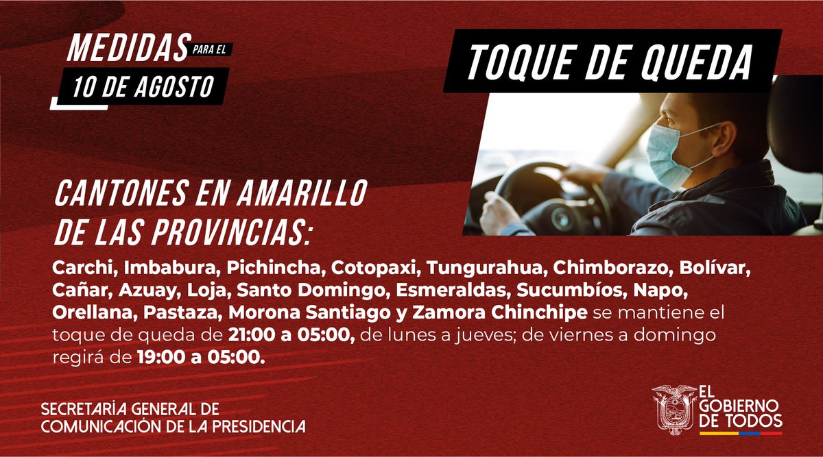 El toque de queda va de 1000 de la noche a 400 de la mañana y el. Con motivo del feriado del 10 de agosto el COE Nacional anunció varias medidas para la movilización de las personas en todo el país.